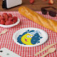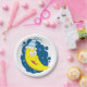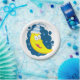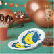 Um rosto amarelo feliz vestindo um chapéu azul e branco. Este design parece realmente eficaz nestas placas de papel