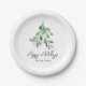 Estas placas de papel festivo são decoradas com emblete verde-aquarela e dizem Feliz feriado na tipografia da na moda. Facilmente personalizável. Original Watercolor © Michele Davies.