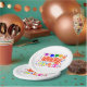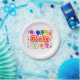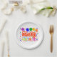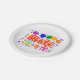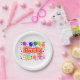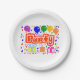 Pratos de papel redondos de 7" opcionais, com um desenho/design da palavra = Festa, na cor vermelha e branca, com alguns balões coloridos, confetes e pacotes de presentes, = (Desenho/design por P. J.M.) = nele.