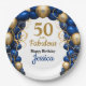 Um balão azul e dourado brilhante e colorido arca qualquer prato de papel de aniversário, mude o texto você mesmo quando você faz o pedido
