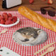 Animais, vida selvagem, festa de aniversário selvagem, lenhador. Foto de uma cabeça de lobo. Um lobo amigável com um sorriso no rosto. É inverno com fundo branco de neve. Um prato para a 8ª festa de aniversário de um menino. Com o texto: Feliz Aniversário (x2) Modelo para o nome da criança, letras negras. Texto curvo.