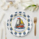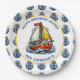 Festa de aniversário de menino com tema náutico ou marítimo em pratos de papel. Âncoras e um veleiro vermelho, amarelo e azul. Adicione o nome da criança na área de personalização.