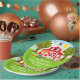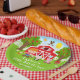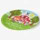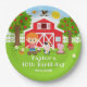Este prato fofo e divertido apresenta um menino de cabelo vermelho com pele clara ao lado de um celeiro vermelho com um cata-vento de galo. Há adoráveis animais da fazenda, como uma vaca, porco e galinha. Ao fundo, há um céu azul brilhante, macieiras, sol, borboletas e margaridas. O texto combina fontes negrito e sem serifa para um visual elegante e moderno. Isso é perfeito para uma festa de aniversário com tema de fazenda.