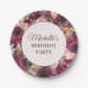 Placas de papel de festa de aniversário floral, cor-de-água, cor-de-rosa, personalizadas e embebidas. Estes pratos pertencem à nossa Coleção de Festas de aniversário Florais Borgonha e Rosa. Entre em contato conosco para obter ajuda com a personalização ou para solicitar produtos correspondentes.