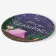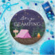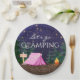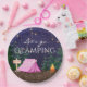 Pratos de papel para festa de aniversário de glamping feminino com uma linda tenda rosa e fogueira em um fundo de floresta noturna estrelada. Estes pratos de papel para festa de aniversário de camping para meninas são facilmente personalizados para o seu evento apenas adicionando o seu texto.