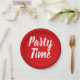 "Hora da Festa" escrita num pincel que escreve sobre um fundo vermelho de explosão solar.