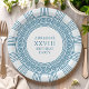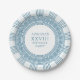 Pratos de festa elegantes para uma festa temática de Toga grega ou romana apresentando um padrão minimalista de meandro grego em azul. Produto personalizável para uma celebração memorável. Perfeito para seus casamentos, noivados, festas de formatura, aniversários de casamento, save the dates, despedidas de solteira e festas de aniversário com tema da Grécia Antiga ou Roma Antiga.