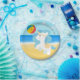 Um adorável, cabeludo azul, unicórnio brincando na praia com uma bola de praia. Perfeito para uma praia infantil ou uma festa de piscina.