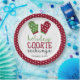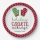 Chapas de papel da festa "Holiday Cookie Exchange" com ilustração de luvas de forno de Natal fofo e design de bolinhas de vermelho e branco. Ilustração digital de Kristine Lee. Para obter mais informações, visite www.kristineleedesigns.com