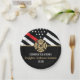 Este design apresenta uma bandeira de bombeiros com listras pretas e brancas, e uma fina faixa vermelha também. "Parabéns" e o crachá de bombeiro ficam acima do nome do bombeiro graduador. Esta design também funciona como excelente para se aposentarem bombeiros, tenentes ou chefes. Celebre em estilo!