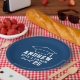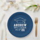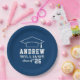 As placas de papel de graduação redonda personalizadas apresentam um design azul e branco marinho (pode ser modificado via "Personalizar!") com um boné de formatura e texto personalizado para o nome do formando e o ano de classe.