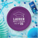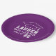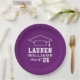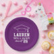 As placas de papel de graduação redonda personalizadas apresentam um design roxo e branco (pode ser modificado por meio de "Personalizar!") com um boné de formatura e texto personalizado para o nome do formando e o ano de classe.
