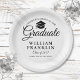 Um prato de papel de festa de graduação preto e branco elegante com um enfeite de capa preta com os detalhes do seu graduado em tipografia moderna. Projetado por Thisisnotme©