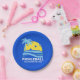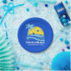 Vestir sua mesa de festa com essas pratos de papel de piquete divertidas. Design apresenta um "sol" picleball emoldurado por uma palmeira tropical e ondas azuis do oceano. Perfeito para uma festa de aniversário de picleball, evento de time de clube, torneio após festa ou quadras de quintal.