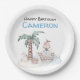 Estas placas de festa de aniversário personalizadas têm um tema de pirata fofo. Uma imagem de um navio pirata é ilustrada no fundo, navegando perto de uma ilha com um tesouro e ouro. Uma pequena gaivota é fotografada em pé na ilha, e uma mensagem em uma garrafa é vista flutuando no mar. Uma mensagem de "Parabéns" é impressa no topo, seguida de um nome de exemplo que você pode personalizar para incluir seu próprio nome personalizado ou outro texto.