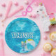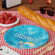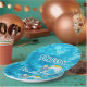 texto "aproveite" em efeito de fonte ondulante para uma festa de piscina de natação com coquetel e bola de praia esmaltada em água piscina turquesa.