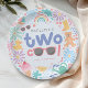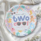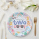 Prato de papel de aniversário de Duas Garotas Legais fofo e feminino para o splash de verão de uma garota ou festa de piscina de criança. Com ilustrações caprichosas cor-de-rosa pastel com tema de água, incluindo um pato de borracha, botas, arco-íris, bolhas, regador e flores. Perfeito para a louça de aniversário das crianças, decoração da festa e celebrações caprichosas e coordenadas de festa de splash.