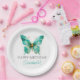 O pequeno Teal Greenbutterfly está virando um. Este giro e giro primeiro aniversario Plates design apresenta uma borboleta verde-clara com borboletas douradas.