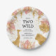 Estas duas placas de papel de segunda festa de aniversário selvagens de safari têm o tema "duas selvagens", apresentando folhas falsas de ouro (girafa, leão e macacos), folhagem dourada e rosa da selva, e uma aspersão de confete de ouro sobre fundo branco. Adicione o nome da aniversariante e outro texto a preto.