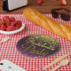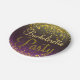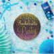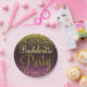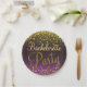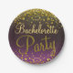 Placas de papel de festa de solteira em cores douradas e roxas.