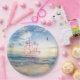Pratos de papel para festa personalizados com texto no centro e imagem de cena de praia. Um nascer do sol no oceano com ondas na costa e pássaros voando é a imagem nos pratos de papel redondos ou quadrados. O texto rosa fúcsia brilhante no centro pode ser personalizado para uma festa de aniversário, congratulações, formatura ou qualquer evento. Uma fonte moderna com letra inicial extra grande é usada. Personalize com o nome da homenageada.