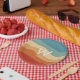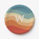 Pratos de papel para festas pessoais da moda com listras onduladas em cores retrô. Grande monograma centralizado e nome associado. Tipografia minimalista limpa e simples. Totalmente personalizável.