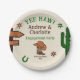 Lindos pratos de papel para uma festa rústica de cowboy no estilo Far West com botas de cowboy, chapéu de cowboy ou Stetson, cacto, distintivo de xerife e ferradura. Com a frase - Yee haw ! Pratos divertidos para uma festa de cowboy ou cowgirl no estilo western. Todo o texto pode ser alterado para personalizar e incluir os nomes dos anfitriões e a data. Perfeito para todas as festas e eventos organizados, como noivados, aniversário de casamento, aposentadoria, aniversário e muitos mais.