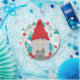 Super divertido e fofo para este feriado. Esta design apresenta um gnomo divertido com cabelos de cinza em duas tranças amarradas com fitas vermelhas, em um chapéu alto contra o fundo das árvores de Natal em tons de turquesa e bolas de natal vermelhas.