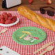 Está na hora da festa! Este adorável e feliz cogumelo e trio de ferramentas vai adicionar alguma diversão de café da manhã a qualquer festa. Desenhado no estilo de ilustração de desenho animado em um fundo de bolinhas verde e branco.