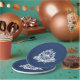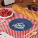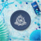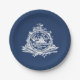 Paper Plate with flag of city of Richmond, Virginia; blue flag with red and white stripes, with white stripes and silhouette of man working James river bateau down the James river
