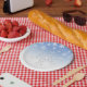 Ilustração gráfica da artista/designer Charmaine Paulson dos flocos de neve de inverno em uma placa de papel da festa.