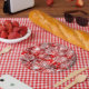 padrão sem costura vetor com flocos de neve brancos e fluffy sobre um fundo vermelho
