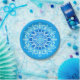Placas de papel em uma mandala texturizada batik / padrão medalhão em tons de aqua, turquesa e azul de cobalto sobre um fundo turquesa