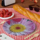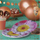 rosa claro bonito e flor amarela com pequenas gotas de água.
