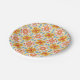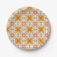 Paper plate with a vibrant, symmetrical floral and geometric pattern in shades of orange, blue, and yellow. Displayed from top and angled views.
