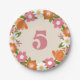 Estas pratos de papel de quinto aniversário super bonitinhas apresentam um quadro floral desenhado pela mão, incluindo margaridas, em laranja, rosa, verde-oliva, ouro mudado e branco. A Tipografia Retro diz, "5" em rosa correspondente. * Ilustração de Tracey Khalei / Impressões Orabella.