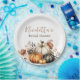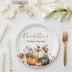 Estas elegantes placas de festa personalizadas apresentam um tema floral de outono com abóboras. Uma imagem aquarela de quatro abóboras de cores diferentes é mostrada na parte inferior. Elas são acentuadas com um buquê de flores secas em cores encantadoras de outono. São maravilhosas para um chá de noiva, festa de aniversário, casamento ou qualquer outra celebração aconchegante de outono.