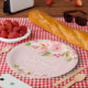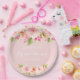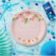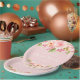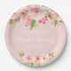 Um prato de papel estilo rústico para um chá de noiva. Com flores de dália pintadas à mão em tons contemporâneos de rosa, pêssego e coral. Um fundo pastel rosa feminino. O nome é escrito com letras brancas em estilo manuscrito.