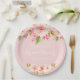 Um prato de papel estilo rústico para chuveirina de noiva. Com flores de dália pintadas à mão em tons contemporâneos de rosa, pêssego e coral. Um fundo pastel rosa feminino. O nome é escrito com letra manuscrita branca.