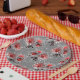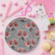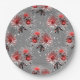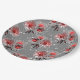 Flores vermelhas em uma cinza de fundo com bolinhas brancas.