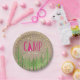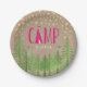 Uma placa de papel russa, mas chic, personalizada para uma festa temática "Glamping" completa com uma tenda numa floresta sob estrelas de ouro de folha falsa.