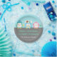 Placas de papel coloridas com os três pinguins pequenos bonitos para a estação festiva do Natal! Um pinguim verde que esteja vestindo um boné do inverno com o teste padrão de ziguezague da viga e um biscoito amarelo da estrela em sua asa. Um pinguim azul com um lenço e uma placa em sua cabeça. Na placa são biscoito um homem de pão-de-espécie e de uma árvore de Natal. Um pinguim cor-de-rosa tem um par de orelha muffles e guardara uma caneca de chocolate com um bastão de doces nele. Estrelas e círculos na luz - fundo azul. Personalize com sua mensagem do Natal e do feriado!