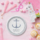 Fontes modernas, contemporâneas, elegantes e à moda do chá de fraldas para combinar esse partido náutico do tema. O design tem uma paleta de cor azul pastel, uma âncora clássica do barco dentro de uma beira do círculo da corda. Personalize o texto dentro do espaço disponível.