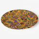 Conjunto de oito placas de papel de 9" com uma imagem de um design geométrico africano laranja, azul, preto, roxo e verde. Ver copos de espresso, caneca, azulejo de cerâmica quadrada, trivet quadrado e portas copos. Veja toda a coleção This & Aquela Plate na seção HOME.