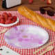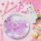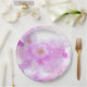 Placas de papel com uma bela fotografia com flores de cereja rosa. Imagem sonhadora com luzes e brilhos.