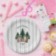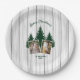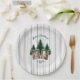 Placa de papel de feriado russa com fundo de madeira de cinza e árvores verdes escuras. Modelos de fotos via Pixabay licenciados sob CC0 e devem ser substituídos por sua própria foto