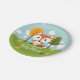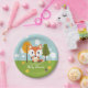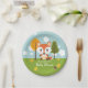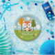 Uma raposa bonito do bebê do vermelho alaranjado e do branco veste um par de fraldas amarelas guardaradas por um pino da fralda. Uma bolota senta-se perto de sua cauda espessa. Estes fox o design neutro do chá de fraldas do género com as árvores coloridas outono e as folhas do carvalho em um dia brilhante e macio da nuvem são perfeitas para um chá de fraldas temático dos amigos da floresta da queda para a mamã que espera um bebé ou um bebé. © Chrissy H. Estúdio dos trabalhos de arte, LLC. Todos os direitos reservados.