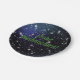Frohe Weihnachten! Feliz Natal no alemão. Estrelas brancas em um fundo preto e azul da noite. Pia batismal verde