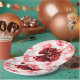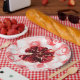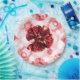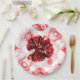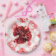 Uma fruta de granada fresca, madrugada, fatia fresca, em fundo floral rosa e branco, com flores suaves.
