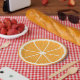 Placa de papel como uma fatia moderna e estilizada de uma laranja, com segmentos detalhados e texturizados - uma ilustração de fruta tropical original criada no Photoshop e no Adobe Illustrator
